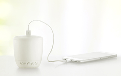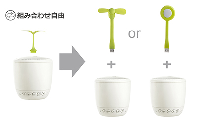 そして気になる、芽のようなもの。これは…、ズバリ飾りです。でもこれ、抜けます。そして抜いたところに現れるのは、USB端子。そこに別売りの「Portaable USB Flower Lamp」(1598円)を挿せばLEDライトに、「Potable USB Flower Bud Fan」(1706円)を挿せば卓上ファンに変身しちゃうんです。もちろんスピーカーとしての機能はそのまま。