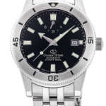 元になっているのは1964年に発売された、オリエントブランド初となるダイバーズウオッチの「オリンピアカレンダーダイバー」。ブラックダイアルにアロー型の時針が映えるスタイリッシュなデザインが印象的で、当時としては珍しい回転ベゼルを搭載しています。