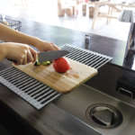 さらにここからが地味ながらいい仕事をする「食器にやさしいシリコン水切り」の真骨頂。シンクの上にサッと広げてまな板を載せれば、あっと言う間に調理スペースに。実は耐荷重が18㎏もあるので、料理の下ごしらえや盛り付けスペースとしても大活躍。狭いキッチンでも使えるスペースが広がります。