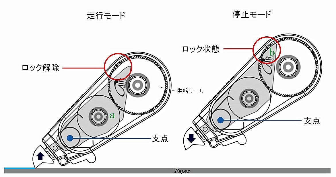 実はこれまでテープの引き出しが重かったのは、紙面からヘッドを離したときのテープのたるみを防止していたため。この方法を改め、テープ走行をコントロールする機構を内蔵。修正ヘッドが紙面に触れる力を利用して「テープ走行(ロック解除)」、紙面から離れると「テープ停止(ロック)」としたことで、常にリールにかかっていた抵抗(重み)を半減させたのだとか。これは今すぐ、試してみたい。