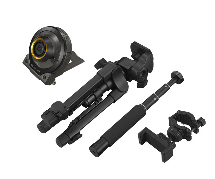 「EX-SA10 GSET」は、デジカメと三脚やホルダーのセットです。デジカメは、近距離から撮影できる超広角16mmレンズ搭載で、屋外での撮影に備えた耐衝撃、防塵、防水仕様の「EX-SA10」。これにミニ三脚・一脚ポール・バーマウント・スマートフォンホルダーがセットになっています。