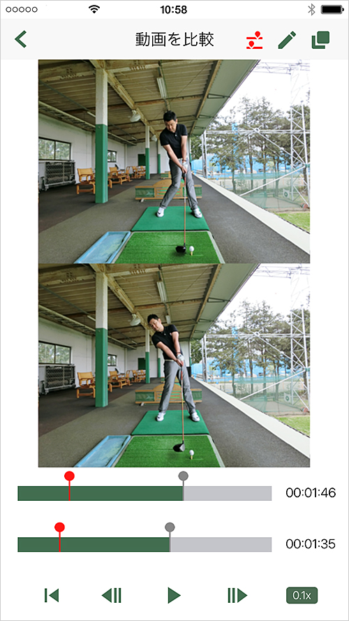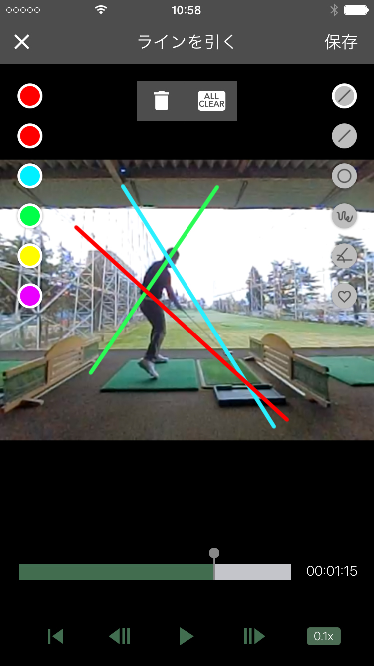 ライン入りの動画を保存も可能です。2画面再生で保存していた過去の自分のスイングと比較も可能。動画再生時にトップやインパクトのタイミングを合わせれば、その違いも明確なはず。