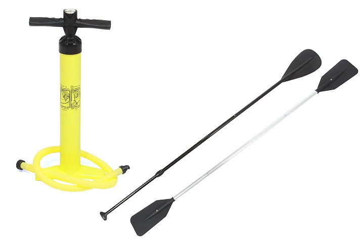 空気圧計付きのポンプと、SUP用、カヤック用2種類のパドルが付属