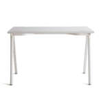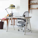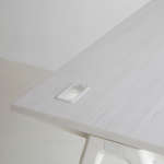明るく清潔感のあるホワイトの木目を基調に、Aライン脚が軽やかな印象を与える「SOHOデスク」は、置き場所を選ばないシンプルなデザインが特徴。解放感のある空間で、膝や太ももへ干渉するストレスを回避しました。スチール素材で強度と耐久性、そして実用性を兼ね備えています。