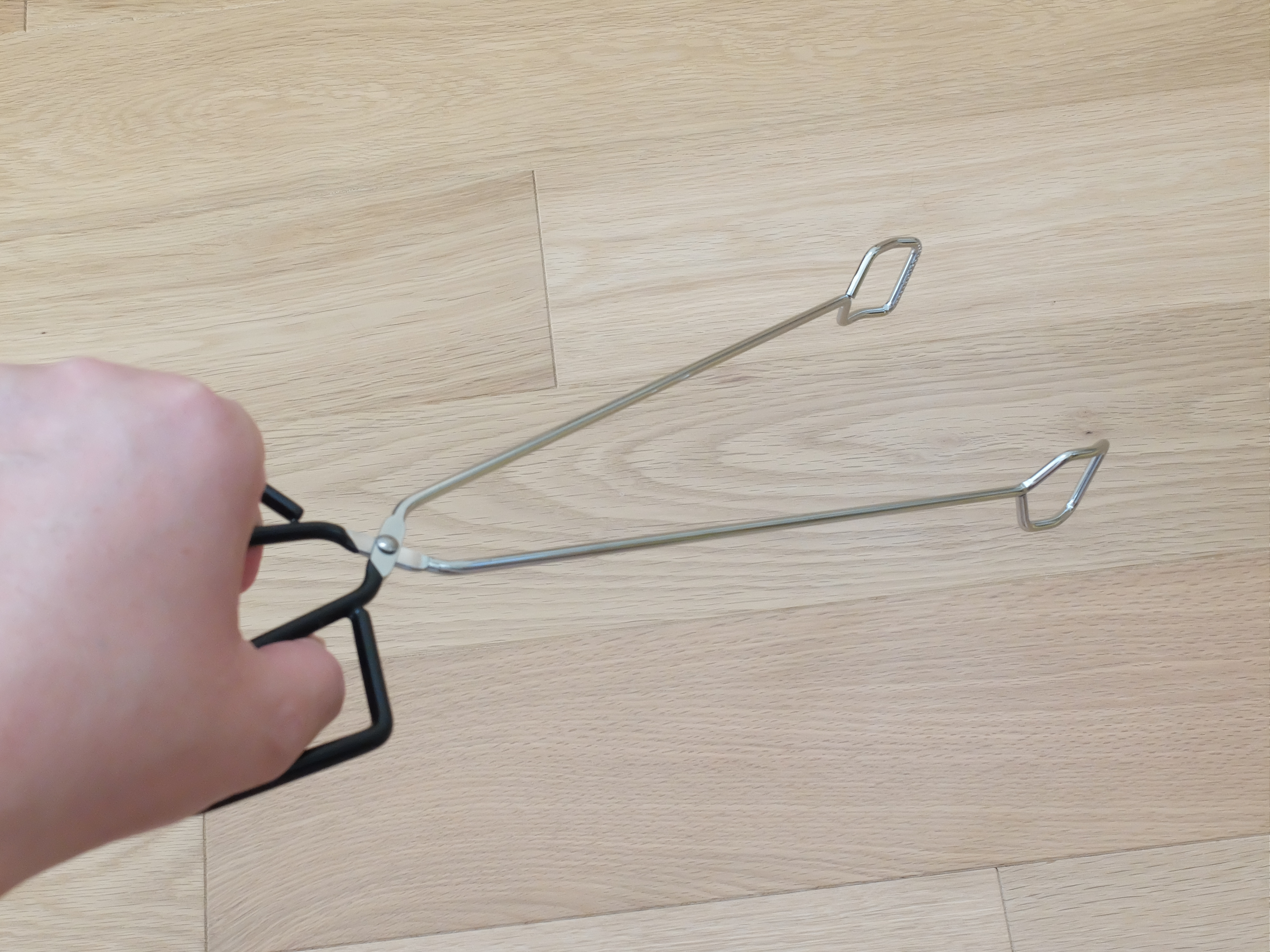 「バーベクック ファイヤートング」はシンプルなはさみ型の炭用トング。ハンドル部は耐熱PVCコーティングを施してあり熱くなりにくい。長さ40cm、価格は1080円。トングは焚き火の必需品だが、以外とかさばるもの。炭火なら、こんなシンプルで軽いトングのほうが扱いやすい。