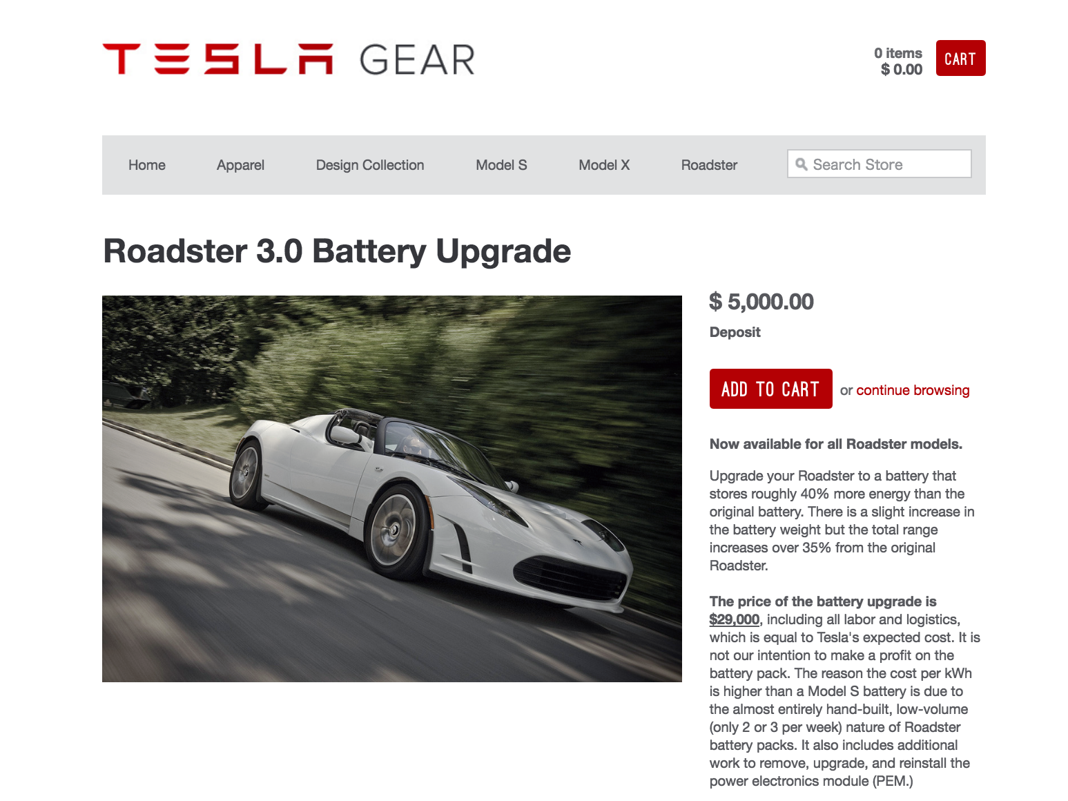 写真はテスラ「ロードスター」向けのオンラインショップ。同様に、モデルS 60kWhもオンライン経由でバッテリーなどのアップグレードが可能