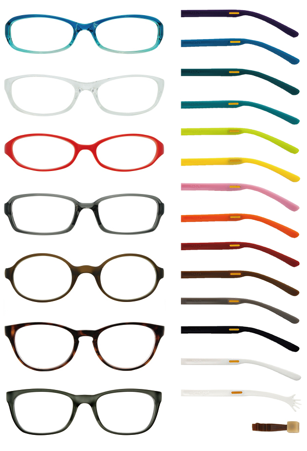 フロント枠(4212円)は新型2種を含む7種類を、テンプル(2052円)は新色3色を含む13色をラインナップ。度数は+1.0〜+3.0まで0.5刻みで5種類。レンズはすべてブルーライトカット仕様だ。加えて、手のひら形がキュートな「ハグテンプル」(2484円)と、こめかみで固定できる「ショートテンプル」(1274円)もそれぞれ入手可能となる。