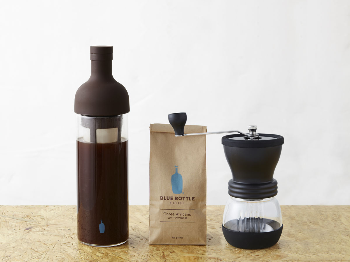 コールドブリューボトルとオリジナルブレンドコーヒー豆(スリー・アフリカンズ)200g、ブリューイングガイド、ハリオのセラミックコーヒーミルをセットした「COLD BREW KIT STARTER KIT」が8640円。ボトルと豆だけの「COLD BREW KIT」(4644円)もある。