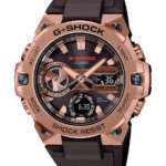 「G-MS」はケースにゴールドを使用し、夜空に輝く金星を表現。ダイヤルリングやインデックスなどに「G-STEEL」のデザインと共通する赤銅色を使用しています。ともにブラウンの樹脂バンドを合わせ、落ち着いた大人の雰囲気。