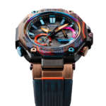 削り出しの部分によって柄の見え方が変化するため、同じものがふたつとないのが特徴。さらに、ベゼルの色調と調和するように時計ケースの各所にカラーIPを施し、マルチカラーなフェイスデザインに仕上げられています。