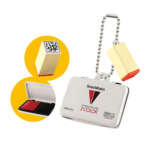 1台に赤と黒の2色のインキが内蔵されたスタンプ台2COLORと「シヤチハタ」の社名が彫られた角印のセット。スタンプ台の蓋はパカッと開き、2色のインキがセットされた製品が再現されています。W3.2×H3.7cm