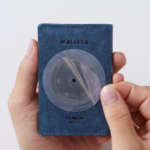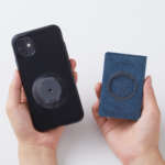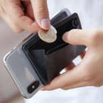 スマホ側のパーツはシールで貼りつけるタイプになっています。「ウォレカ」本体に付いているレールパーツをスマホ側のパーツに合わせて、 反時計まわりに90度回転させるだけで装着完了。スマホ側のレールパーツは厚さ約2mmなので、「ウォレカ」を外しているときも気になりません。