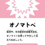 このゲームのポイントは“アプローチカード”。例えば、オノマトペカードが出た場合は、“ガンガン”や“グルグル”など擬音語や擬態語を使用しなければならず、なりきりカードが出たら、上司や恋人、子どもなど指定された役職になりきって“セラピーワード”を伝えなければなりません。もちろん、症状名が含まれる単語は使用できないので要注意です。