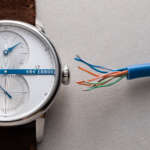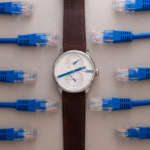 レギュレーターの特徴ともいえる分離された時・分・秒針のカラーには、LANケーブルでよく使われる鮮やかなブルーを採用。アナログな時計と、デジタルなインターネット環境をまとめたカラーデザインです。