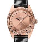 ポリッシュ仕上げのベゼルやリュウズ、針、オメガロゴ、インデックス、コンステレーションの星などのディテールには、18Kセドナゴールドを使用しています。ダイヤルと同系色のアリゲーターストラップもポイントです。