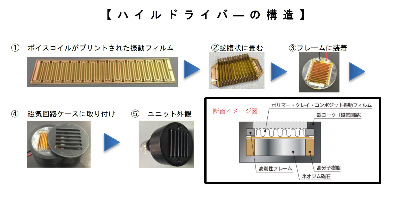 粘土を主原料とし、高柔軟性、高耐熱性、低熱収縮性といった特性を持つこの新開発素材に着目したオオアサ電子が、住友精化、産総研の協力のもと、蛇腹状に折り畳んだ「ハイルドライバー方式」の振動フィルム部分への採用を実現。フィルムの折り方を含めた製法を刷新し、より自然な音色を再現できるようになりました。