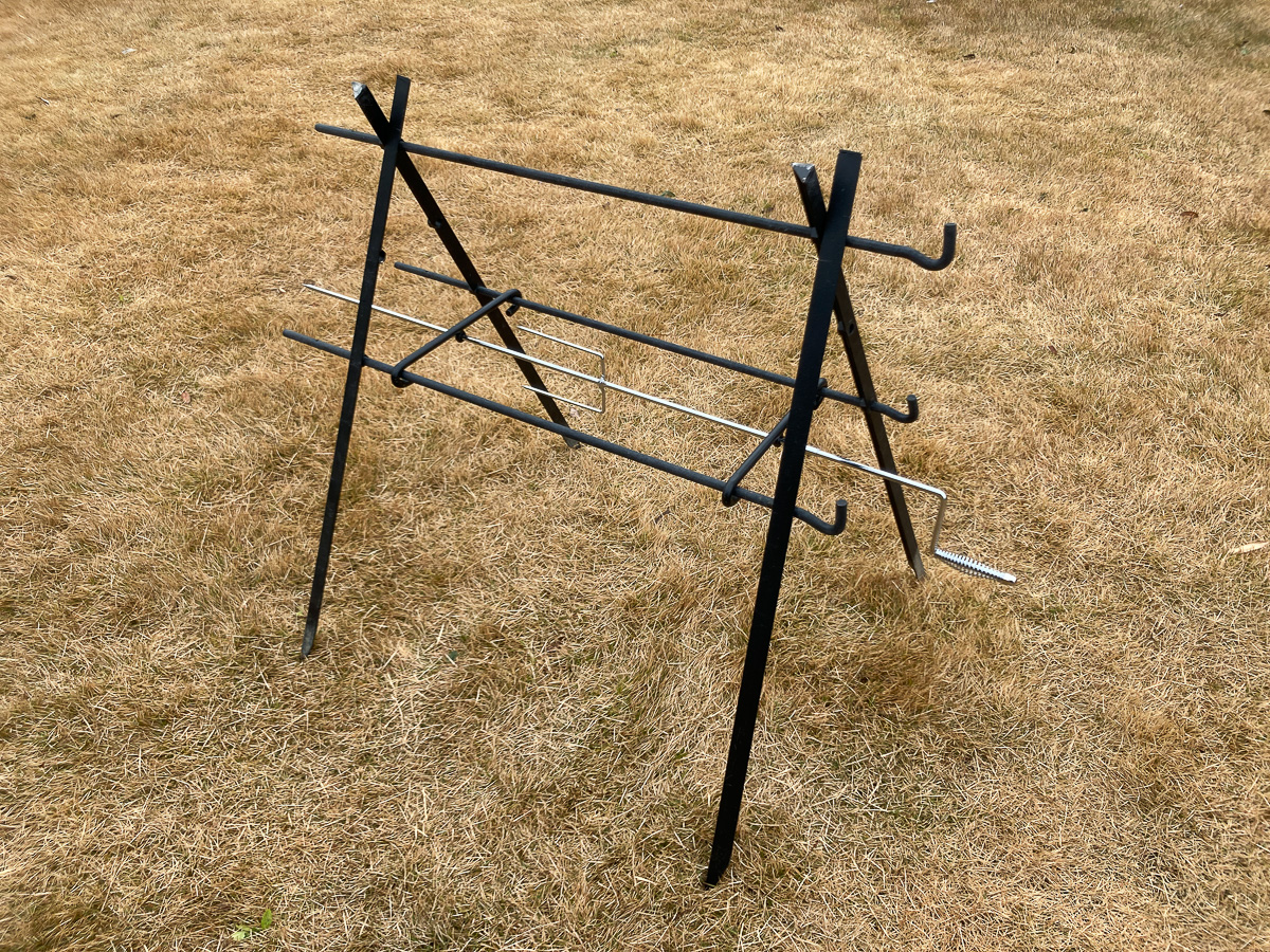 尾上製作所が展開しているアウトドアグッズブランド・ONOEより発売中の鉄製ハンガー「マルチハンガー」に、キャンプ料理好きには堪らない新アイテム「マルチハンガー用丸焼きキット」が登場します。その名の通り、肉の塊を丸焼きすることができるオプションアイテムです。