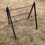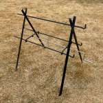 「マルチハンガー用丸焼きキット」は、肉を固定するコの字型のバーを備えた長さ900mmの本体(スキューア)と、肉を挿したスキューアを回すためのハンドル、スキューア全体を「マルチハンガー」にセットするための取付金具と2本のハンガーで構成されています。