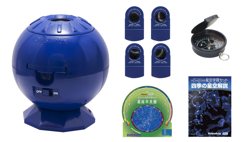 セット内容は、「HOMESTAR Lite2」にコンパス、星座早見盤、4種類の原版、ガイドブック「四季の星空解説」。
