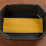 ロングパスタを茹でるには、どうしても縦にパスタが入る深い寸胴鍋が必要。その前提を一から問い直したのが「マルチパスタパン」です。横に長い八角形の浅形パンにすることで、ロングパスタを横に寝かせて入れることができ、少ない水量で茹でることができるのが特徴です。