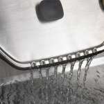 もうひとつのポイントは、波形スリットの入ったフタ。鍋の持ち手にぴったりとフタを嵌めた状態でスリットを下にして傾けることで、簡単に湯切りができる仕様です。パスタが飛び出ず湯をせき止めないちょうどいいスリットの隙間、湯が流れ出やすいよう本体に設けられた傾斜など、細かい部分も考えらえてつくられています。