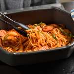 さらに、内側にフッ素加工を施した本体では食材を炒めることもでき、そこにソースとパスタを混ぜ合わせれば出来上がり。一台で、茹で・湯切り・炒めの3役をこなすことができるというわけです。約500gまでのパスタを茹でられるので、1人分100gと考えれば5人分ほどを一度に作ることが可能。