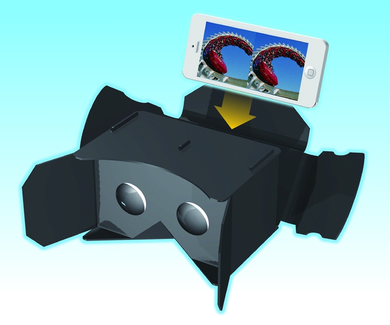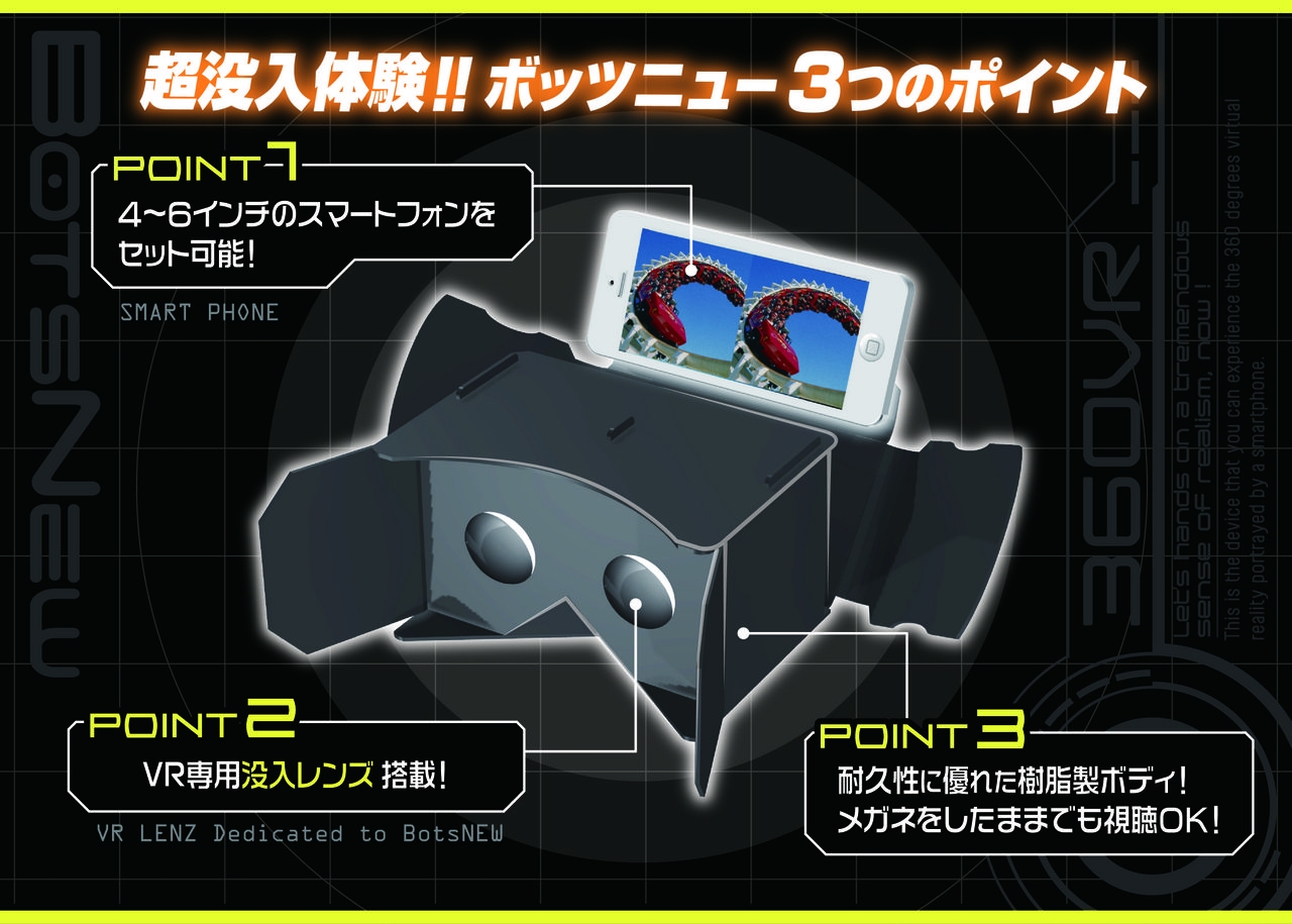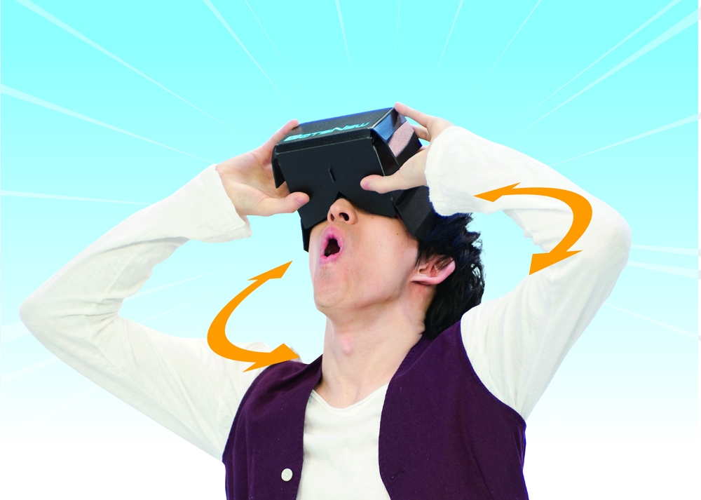 4~6インチのスマホに専用アプリをダウンロードして本体にセット。メガネのようにかけると、視界が360度全方位に動く「超VR体験」がスタートする。