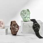 ケースサイズ40mm、厚みは11mm、重さは33.8g。女性の腕にもピッタリのスマートなサイズ感。カラーはこちらの4種、Slate/Black、Peach Gold/Ivory、Peach Gold/Cocoa、 Silver/Cool Mint。