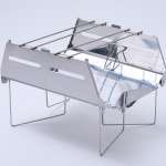 使用時サイズは275×340mm、高さ230mmで、折りたためば145×340mm、厚さ36mmまでコンパクトに。携帯や保管に便利なキャリーケースも付属します。本体素材には錆びや劣化に強いステンレス素材・SUS430を使用、耐久性と携帯性の良さを両立させる絶妙な設計によって、本体重量は約1.1kgまで抑えられています。