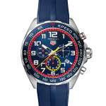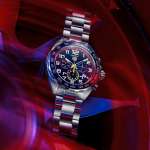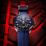 F1カーのコックピットからインスピレーションを得たという視認性の高いダイヤルは、サンブラッシュド仕上げを施した深みのあるブルーがベース。その外周にデザインされた目盛り表示や、6時位置の1/10秒を計測するクロノグラフカウンターには、鮮やかなレッドとイエローのディティールがデザインされています。