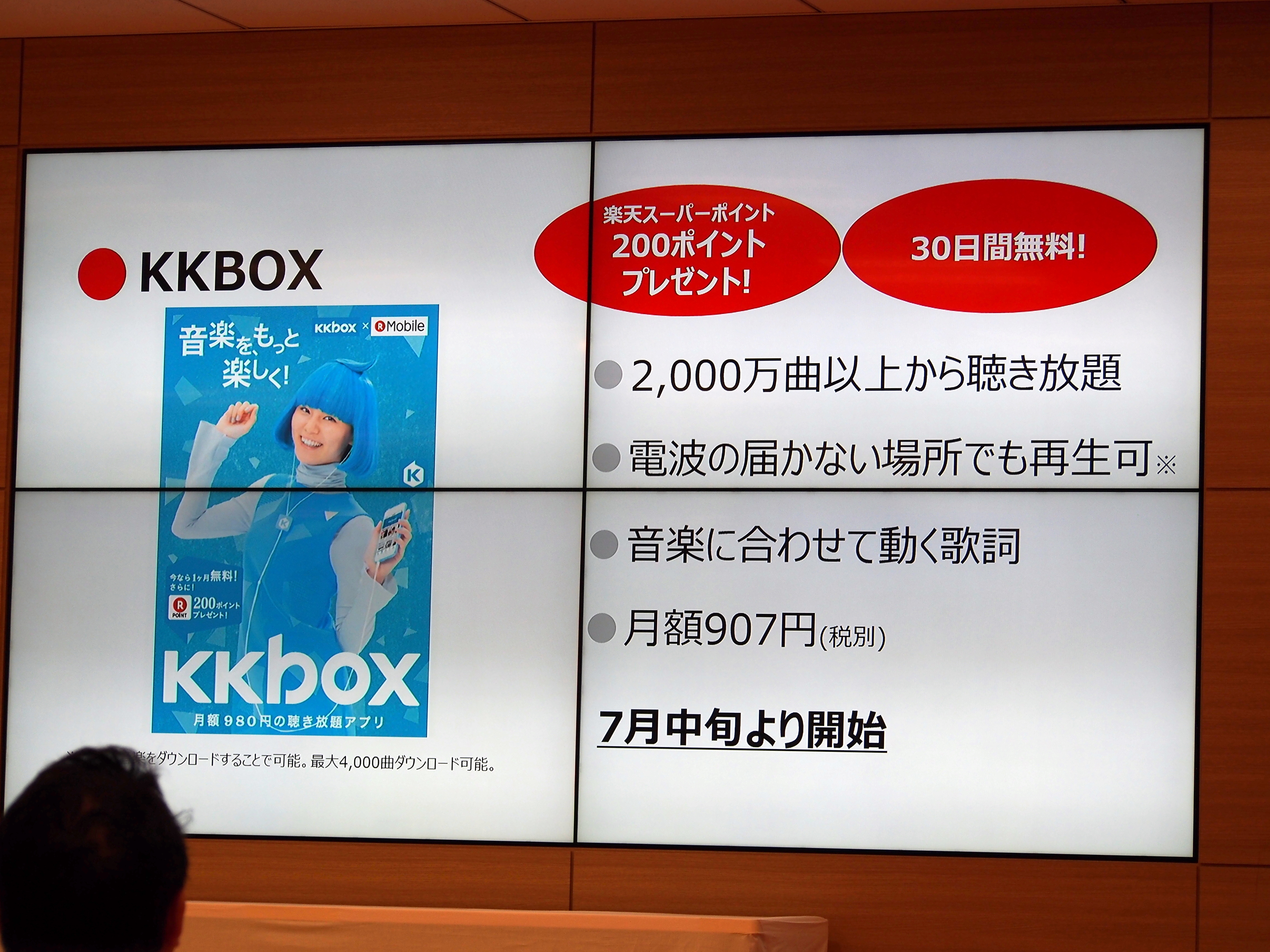 楽天モバイルのユーザーがKKBOXに申し込むと、楽天スーパーポイントが200ポイント付与されます。提携開始は7月8日で、サービスの利用料は月額907円です。
