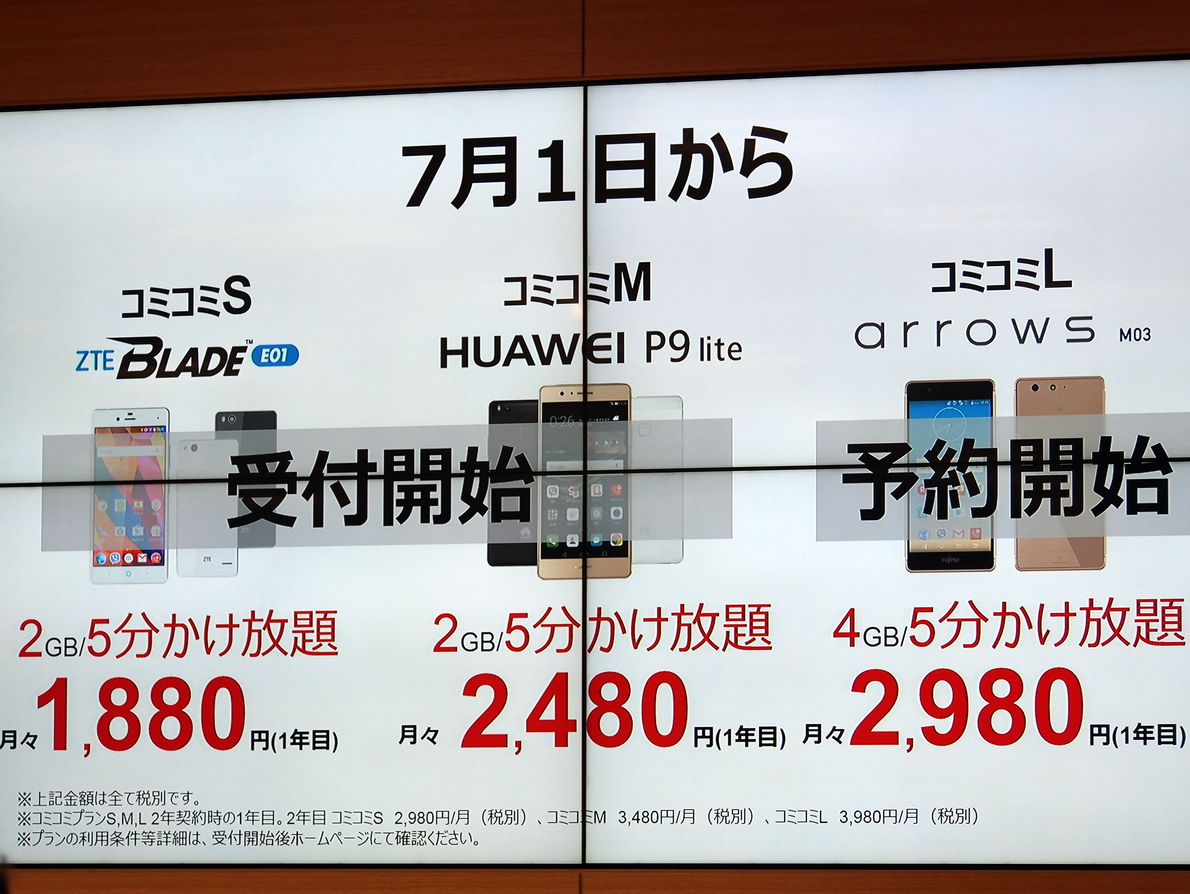 「コミコミプランS」は、2GBのデータ通信と「5分かけ放題オプション」、「ZTE BLADE E01」がセットで1年目が月額1880円(税抜、以下同)、2年目は月額2980円、3年目以降は月額2446円。「コミコミプランM」はセットの端末が「HUAWEI P9 lite」で、1年目が月額2480円、2年目は月額3480円、3年目以降は月額2230円。「コミコミプランL」は、4GBのデータ通信と「5分かけ放題オプション」、「arrows M03」がセットで1年目が月額2980円、2年目は月額3980円、3年目以降は月額2613円です。