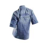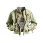 フロントとバックにあしらわれた圧着パッチやグラフィックプリントがポイント。フロントに深いフラップポケットを備えています。ボタンホールを使って襟を完全に閉じることもできます。