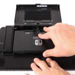 そこで活用したいのがこの「ORION」。ひと言で言えば、背面にSwitch本体格納用スロット、両サイドにスライドレールを備えたモバイルディスプレイです。背面のスロットに手持ちのSwitchを接続、左右のレールにJoy-Conを装着することで、ひと回り大きな画面で迫力あるゲームプレイが楽しめるようになります。