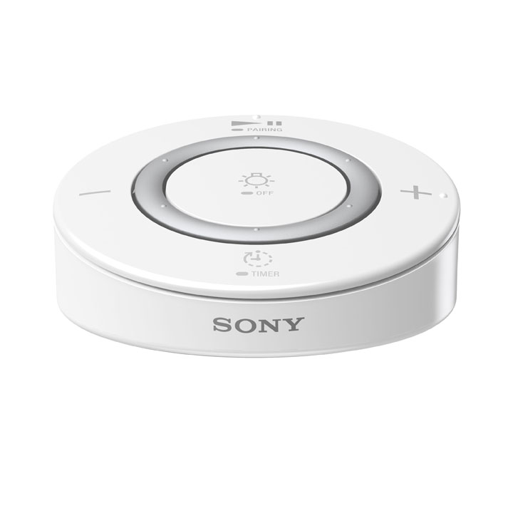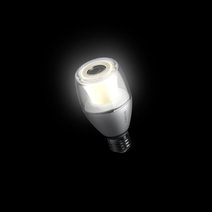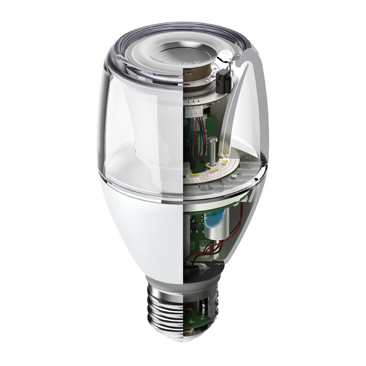 「LSPX-100E26J」はBluetooth接続によりスマホの音楽を転送して鳴らす仕組みで、電球のオンオフやボリューム、調光のコントロールができるリモコンが別途付属する。口金は最も一般的なE26。明るさは約360ルーメン(30w相当の明るさ)。