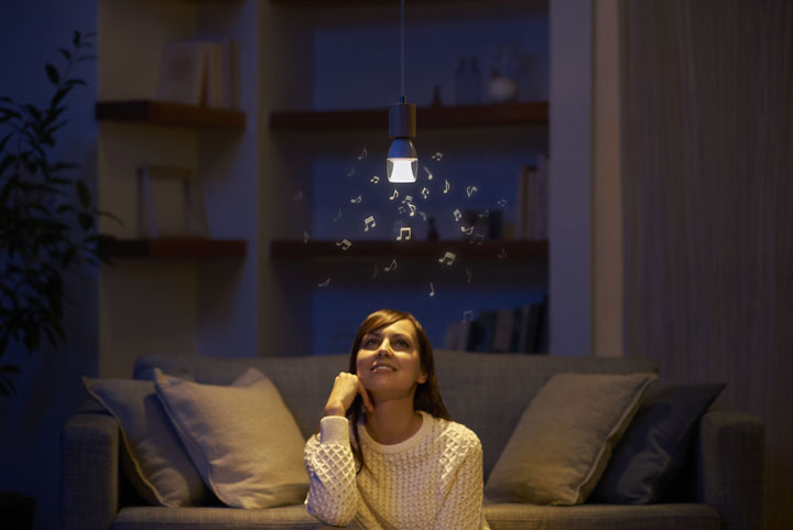 この商品はくつろぎの色である電球色のLED電球にスピーカーをドッキングさせて、より“くつろぎ感”を演出できるようにしたアイテム。サイズは一般的な電球とほぼ同じだが、前面にスピーカーを埋め込んであるのがスゴいところ。直径40mm、2Wのフルレンジスピーカーのサウンドは、映画のようなサラウンドとも高級オーディオのような迫力あるものとも違う、暖かみのある、いわばアナログ的なサウンドを奏でてくれる。