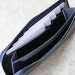 札入れは、手前に仕切り(壁)がないつくりで紙幣の出し入れが簡単。奥のマチ部分には縫い代を設けない設計にすることでゆとりが生まれ、紙幣がファスナーに噛まれにくい構造になっています。