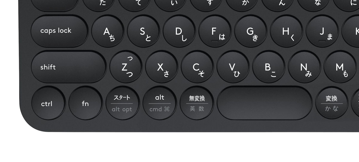 最下段は左から [ctrl] [fn] [スタート/alt opt] [alt/cmd ⌘] [無変換/英数] [スペース]… となっている。Macの場合は左ふたつは使わず、Windowの場合はフルに使う形になる。このように、どのOSであろうが、キーが足りないということにならないのはありがたい