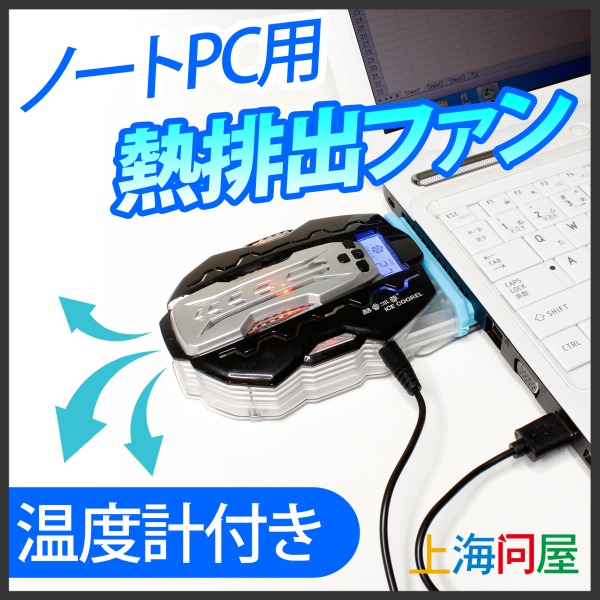 ノートPC内の熱を排気口から直接吸引し排出する冷却装置で、外側から風を当てるタイプのPCクーラーよりも効率よく熱を放出できる。
