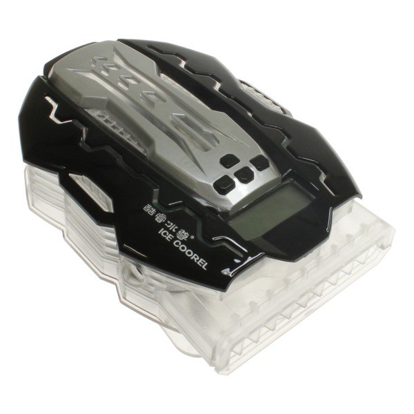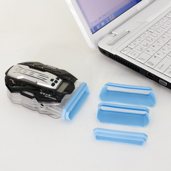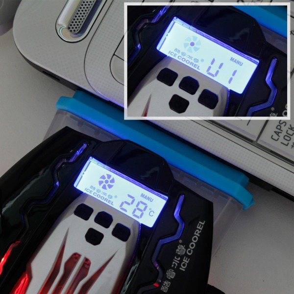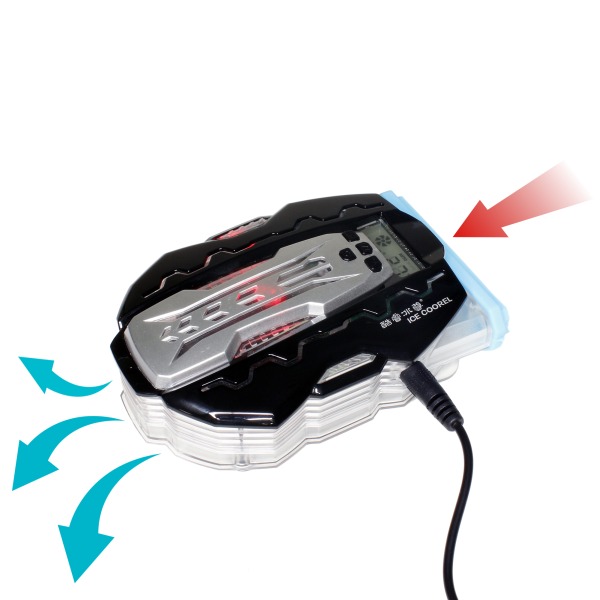 給電用USBケーブルをノートPCに接続し、電源を入れてスイッチをONにするだけ。風量は5段階に切り替えることができる。風量と排熱温度が表示される液晶ディスプレイや若干SFチックなデザインも楽しい。価格は1999円。