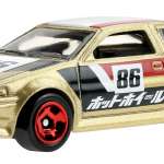 「トヨタ AE86 カローラ」は、『頭文字D』で一躍人気となったカローラハッチの“ハチロク”をレースマシン仕様にしたものをモデルに。ボンネットとドアのゼッケン風“86”と昭和レトロな“ホットホイール”の文字が、なんとも80年代な雰囲気。