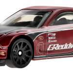 通称“FD”として今も人気の三代目RX-7、「アンフィニ・RX-7」を再現した「'95 マツダRX-7」。ブラックとワインレッドのカラーリングに、パーツブランドTRUSTの海外でのブランド名である「GReddy」のロゴを配置。なのに、リアタイアのそばには「峠」と書かれたステッカーが。海外ブランド、ホットウィールらしい雰囲気ですね。