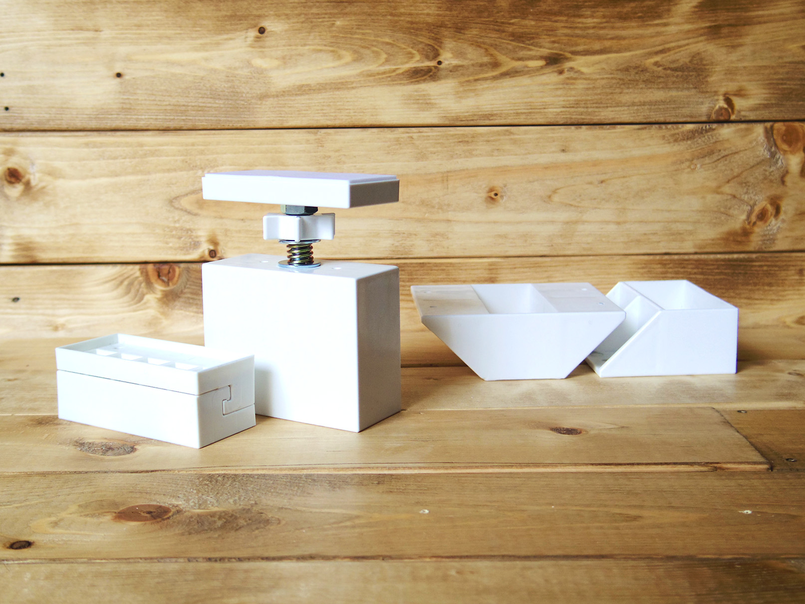 「2×4ジョイント」は、短い木材を1本の長い木材としてつなげて使用するためのパーツ。長い木材を2つに切り分けて持ち帰ったり、余った木材を組み合わせて活かすことができる。「2×4棚受シングル」「2×4棚受ダブル」は、木材を使った棚をかんたんに設置できるパーツ。ウォールシェルフや靴棚など、用途にあわせて様々なインテリアを手作りできる。