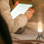 付属の三脚台を取り付ければ、テーブルランプや足元灯のような間接照明として手元や足元を照らすこともできます。よりおだやかな灯を楽しみたい人のために、アーガイル調のスリットの入った本革製ランプウォーマーも付属、アウトドアや防災への備えとしてはもちろん、日常使いのインテリアとしても使えそう。
