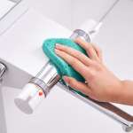 もちろんバスタブの水あかや、洗剤でも落ちにくい鏡のウロコ汚れも効果を発揮。薄型で手のひらにおさまる涙型形状(W97×D20×H114mm、重さ10g)なので、蛇口回りなどの細かい場所にもぴったりフィット。浴室内だけでなく、洗面台やトイレの手洗い器などのお手入れにも使えます。