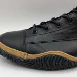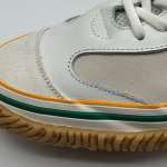 フォクシングテープにコーポレートカラーのオレンジとグリーンラインを配することで、20周年を連想させるアニバーサリー感を演出。また、アッパーが内羽根のデザインで若干タイトなフィッティングを考慮して、シューレスには伸縮性のあるゴムを採用。カチッとした見た目ながら、脱着がしやすくなっています。