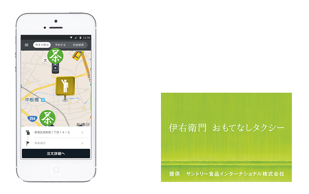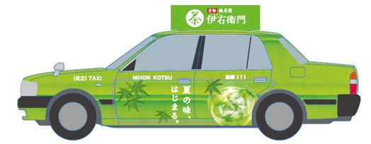 タクシー大手の日本交通とタッグを組むのは、なんとサントリー緑茶・伊右衛門。タクシー車内にのれんや特製うちわがあり、乗車の際には冷えた「夏の伊右衛門500ml」と特製うちわ、専用袋に入ったスリッパを無料でプレゼント。