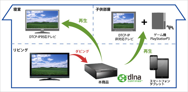 また、手持ちのテレビがDTCP-IPに対応していない場合でも、PlayStation3やネットワークメディアプレイヤーで録画番組の再生が可能です。