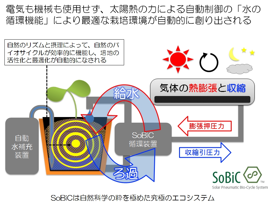 電気や水道をセットする必要もありません。「SoBiC」は、太陽の熱エネルギーを直接動力変換して、水を自動的に循環&稼働させる事を実現しています。つまり、放っておいても勝手に野菜を育ててくれますシステムなのです。