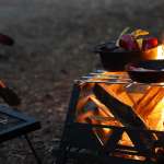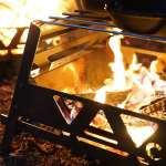 本体サイズは展開時で幅570×奥行き375mm、高さ335mm。天面に付属のグリルを載せればダッチオーブンやスキレットを使った調理もできるし、グリルを外せば全面オープンになるので、太く大きな薪もガンガン燃やせます。
